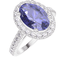 Anillo Oro blanco 18 quilates - Zafiro azul Ovalo 1 quilates - Halo Diamante - Engastado Diamante