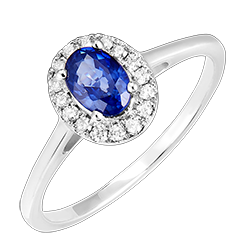 Anillo Oro blanco 18 quilates - Zafiro azul Ovalo 0.5 quilates - Halo Diamante