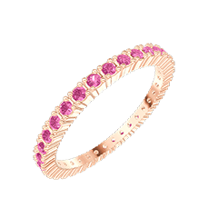 Esta alianza de la Colección Origen destaca por su diseño clásico y refinado. Fabricada en oro rosa de 18 quilates, presenta un círculo completo engastado con 33 zafiros rosas que suman 0,46 quilates.