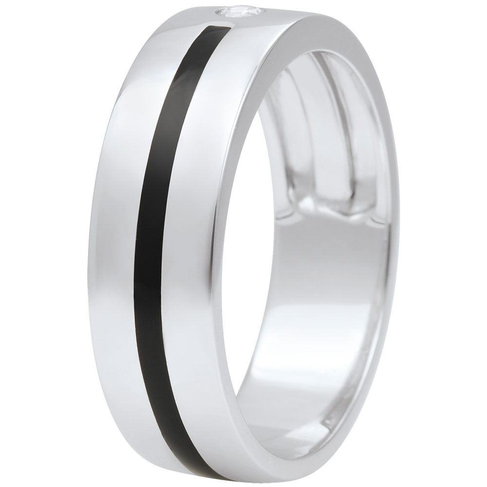Esta Alianza Claroscuro de oro blanco cuenta con un Diamante central y está dividida longitudinalmente por una banda de laca en un negro azabache.