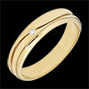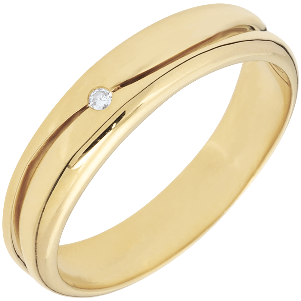 Un anillo ancho de oro amarillo es atravesado por una onda que lo divide en 2 partes. Un diamante centelleante en el centro de la alianza.