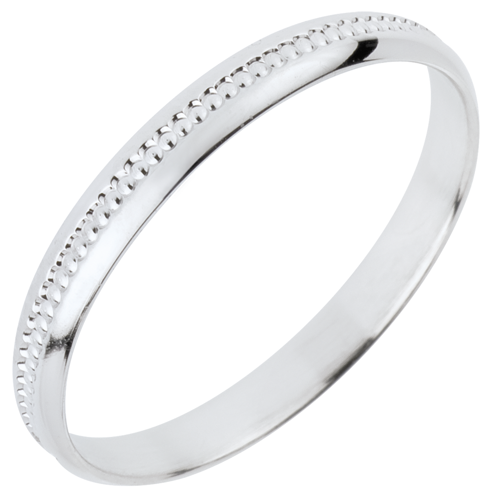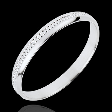Los clientes valoran la calidad y el acabado cuidado de esta alianza en oro blanco. Su brillo y diseño elegante son especialmente apreciados, así como la opción de personalización mediante grabado.