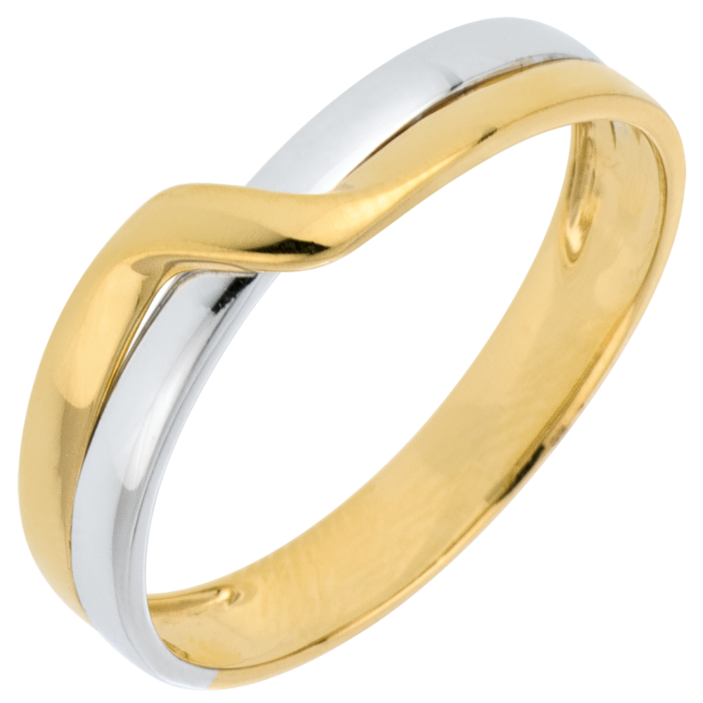 Un anillo de oro blanco es enlazado con pasión por una cinta de oro amarillo.