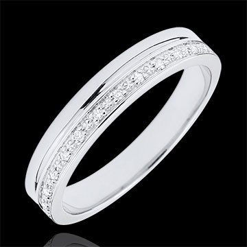 Una banda de oro blanco se combina con una banda de oro blanco salpicada de diamantes. Una alianza de matrimonio para mujer delicada y elegante.