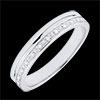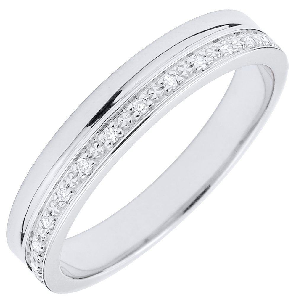 Una banda de oro blanco se combina con una banda de oro blanco salpicada de diamantes. Una alianza de matrimonio para mujer delicada y elegante.