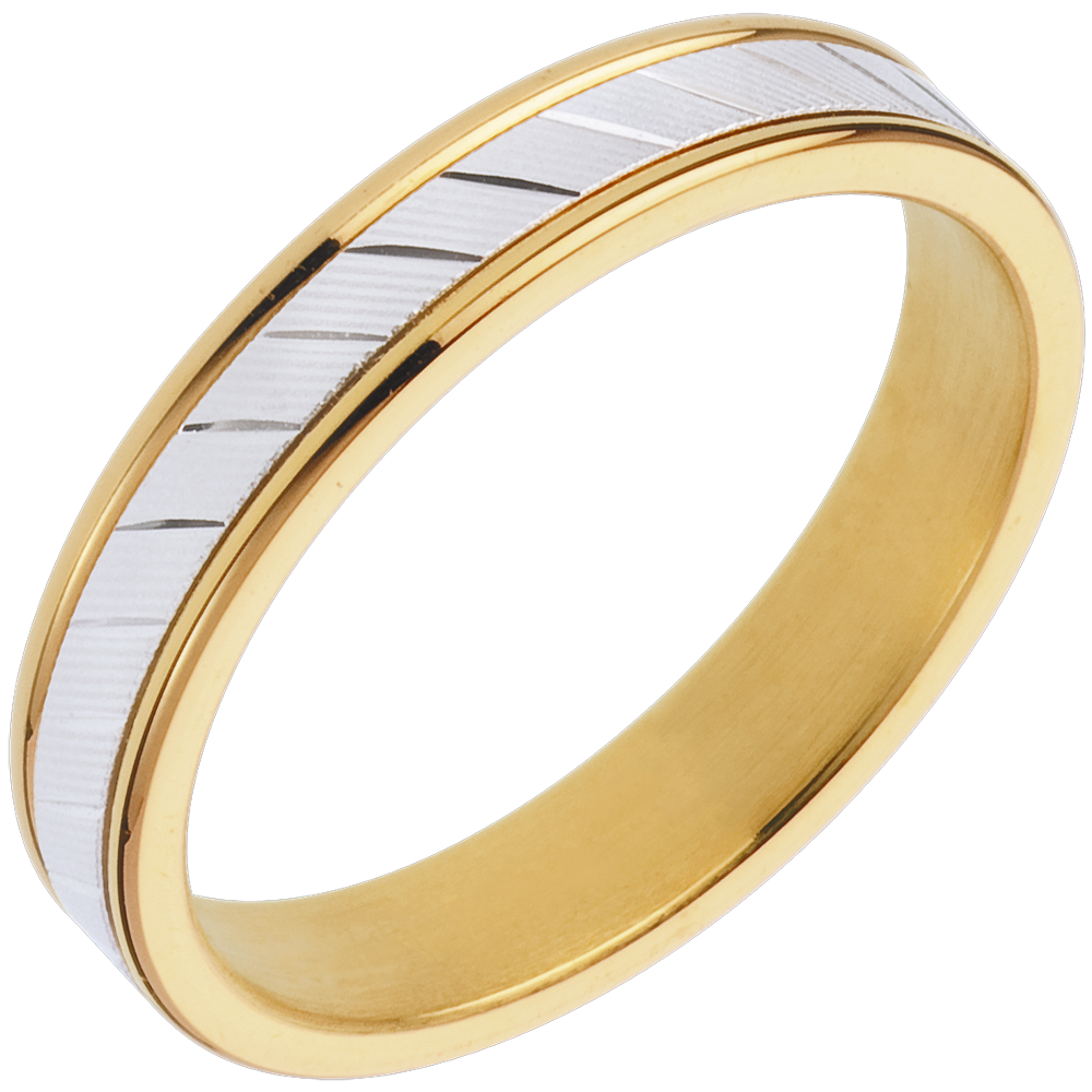 Una alianza sobria y original de oro un color amarillo, subrayada por un arco de oro una central blanca y grabada.