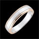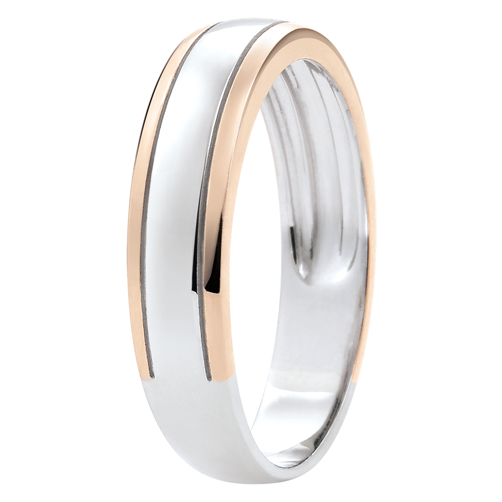 Una alianza cinta de oro blanco y oro rosa con detalles horizontales atemporales. Esta alianza para hombre de oro blanco es un clásico rediseñado de la tradicional alianza de bodas.