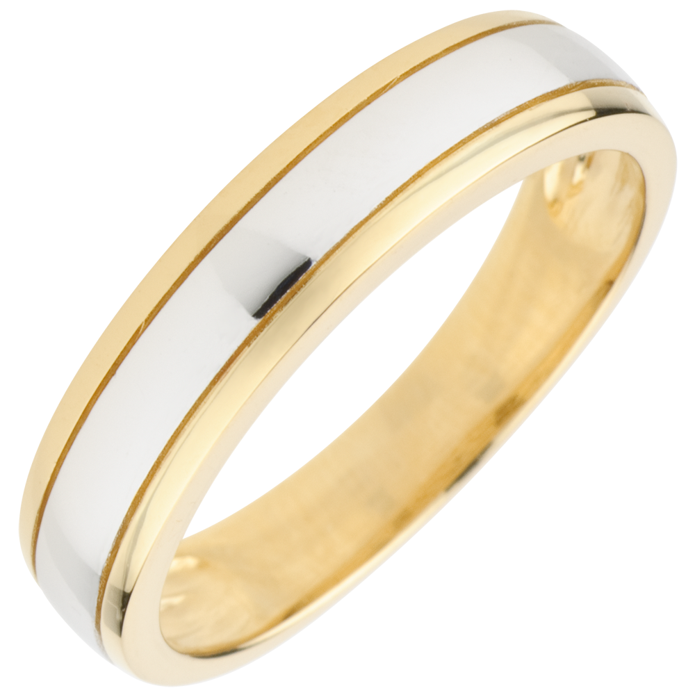 Este anillo de boda de oro blanco y oro amarillo para hombres también puede ser usado por una mujer debido a su anchura de 4 mm.