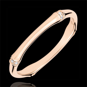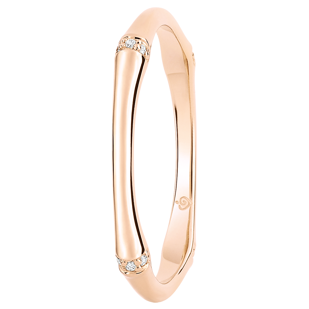 Una rama de bambú flexible y sólida se transforma en un anillo de oro rosa eterno, pavimentada de diamantes.