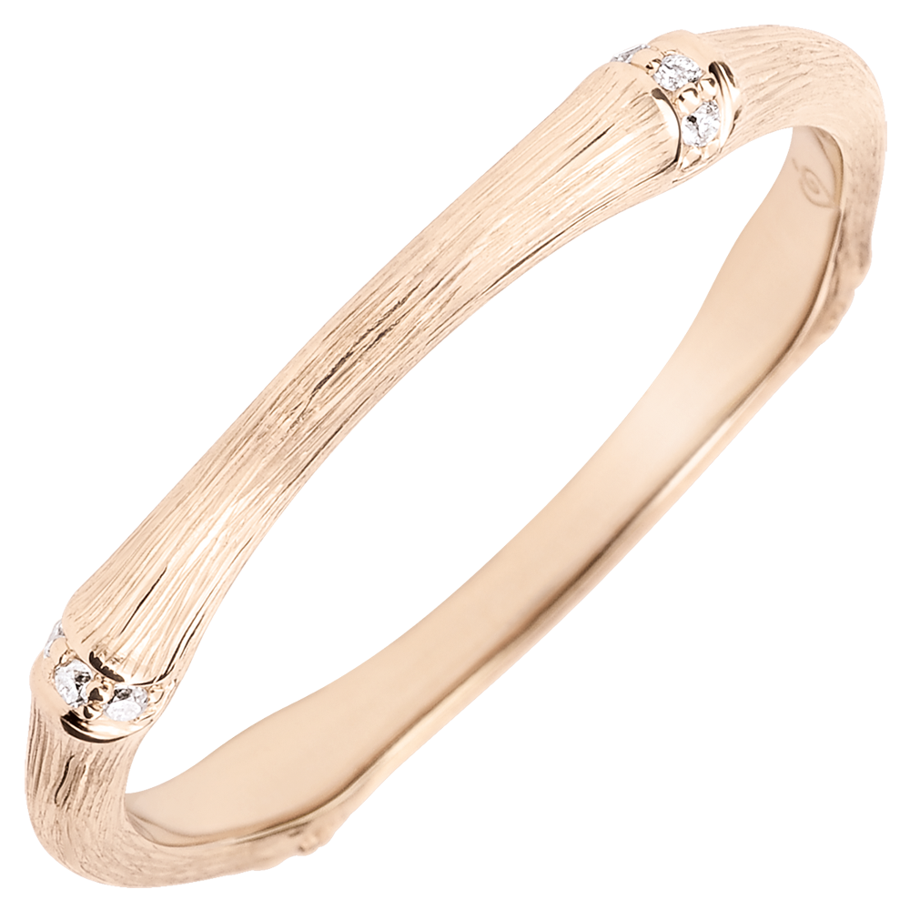 Una rama de bambú flexible y sólida se transforma en un anillo de oro rosa eterno, pavimentada de diamantes. El trabajo hecho a mano del acabado mate le da un aspecto realista y natural.