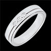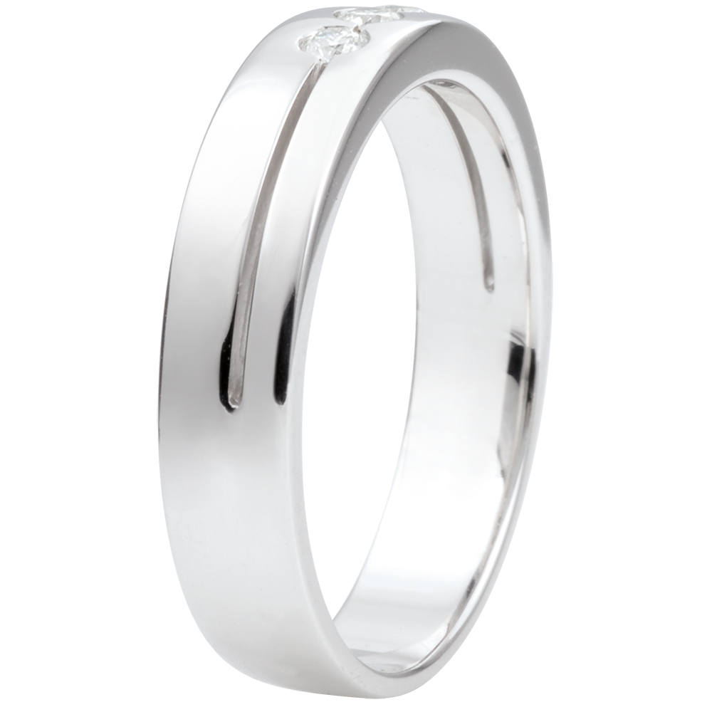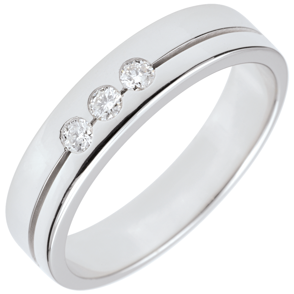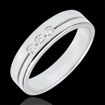 Esta alianza con un diseño de alianza doble realzado por una línea horizontal que la divide en dos y en cuyo centro se aloja una trilogía de diamantes.