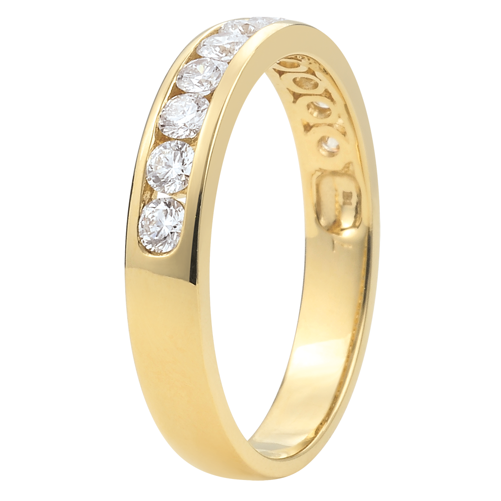 El equilibrio perfecto de un anillo de oro amarillo con 11 diamantes redondos con engaste de carril consigue transmitir un fuerte simbolismo. Una joya ineludible para sellar un enlace de excepción.