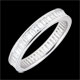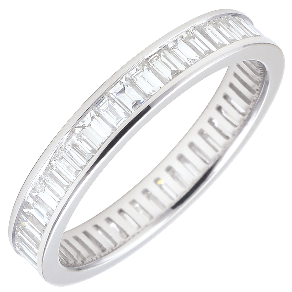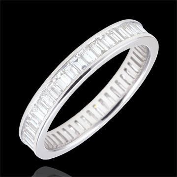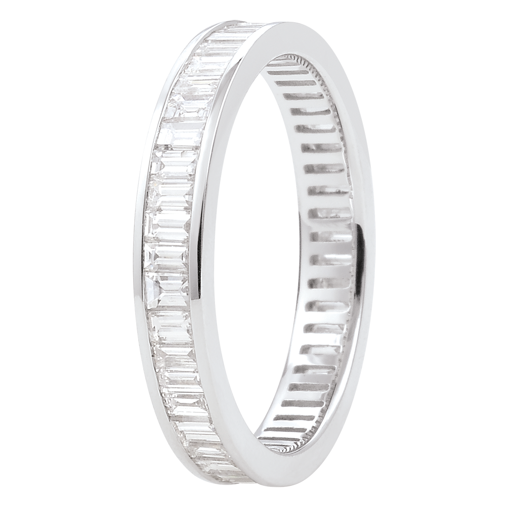 El equilibrio perfecto de un anillo de oro blanco pavimentado de diamantes de talla baguette con engaste de carril consigue transmitir un fuerte simbolismo. Una joya ineludible para sellar un enlace de excepción.