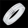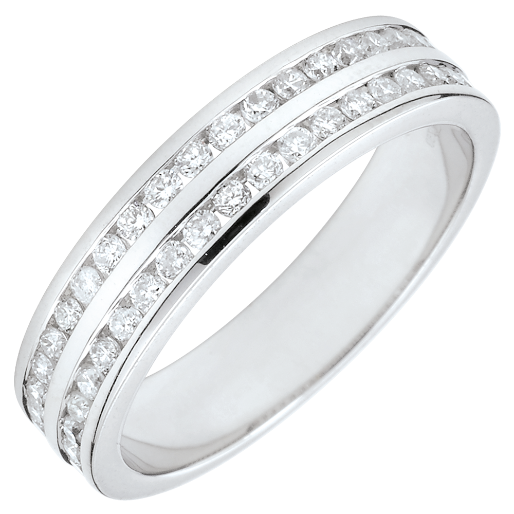 El equilibrio perfecto de un aro de oro blanco con 2 hileras de diamantes redondos con engaste de carril consigue transmitir un fuerte simbolismo. Una joya ineludible para sellar un enlace de excepción.