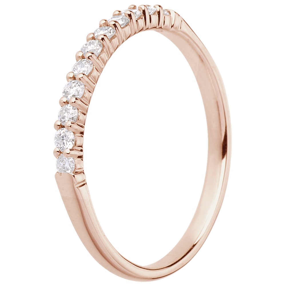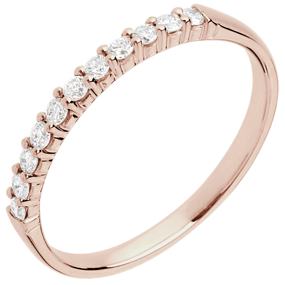 Sencilla a la par que brillante.Una alianza de oro rosa con 11 diamantes engarzados que hacen de este anillo una joya eterna y resplandeciente.