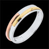 Una venda de oro blanco es flejada por una cinta de oro amarillo y rosa. Una alianza tres oro moderno y único.