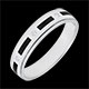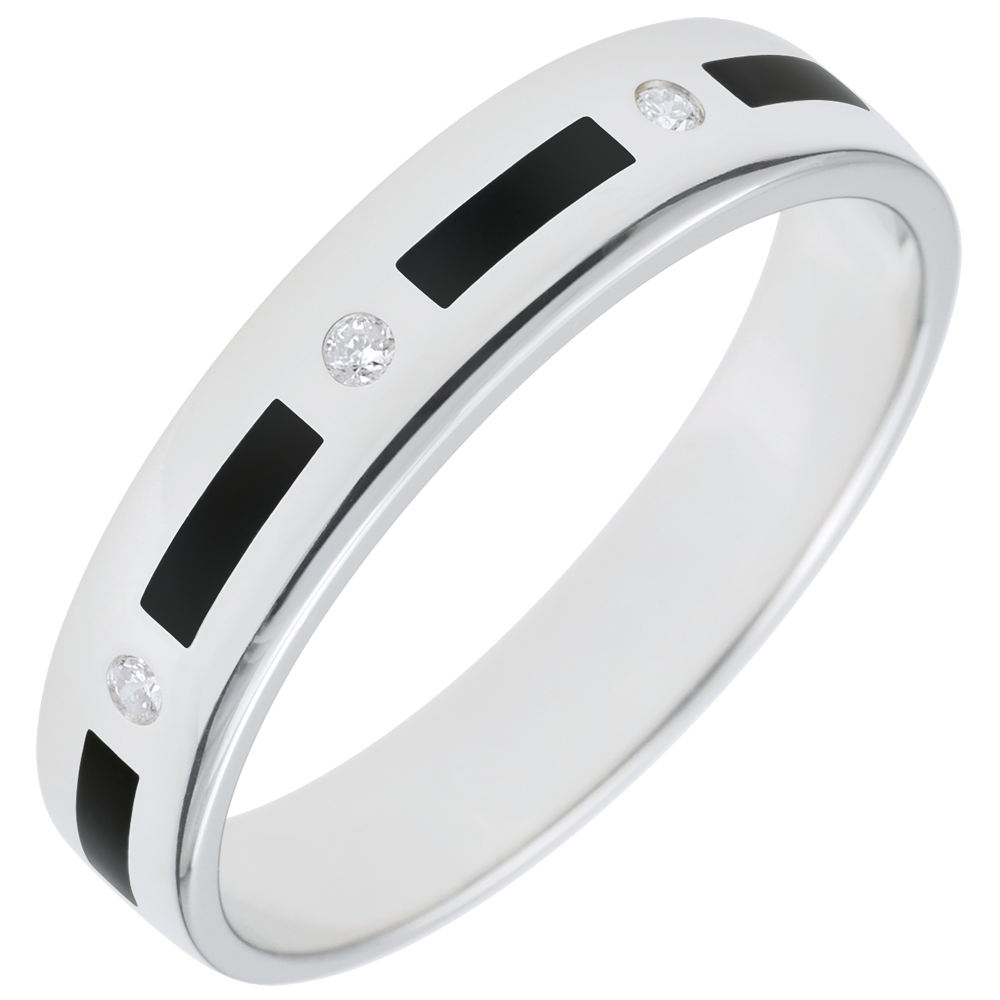 Un anillo ancho de oro blanco cruzado por un trazo discontinuo alternado con diamantes. Un diseño simple y depurado.