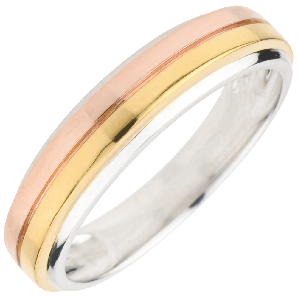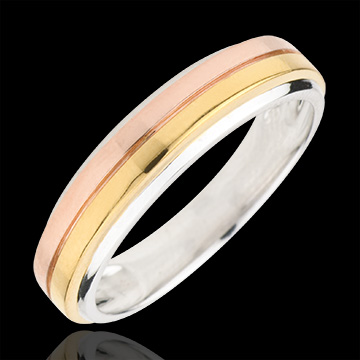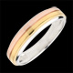Un anillo de oro blanco cubierto de un relieve horizontal compuesto por dos bandas de oro rosa y amarillo. Un bello saliente para una alianza de tres oros.
