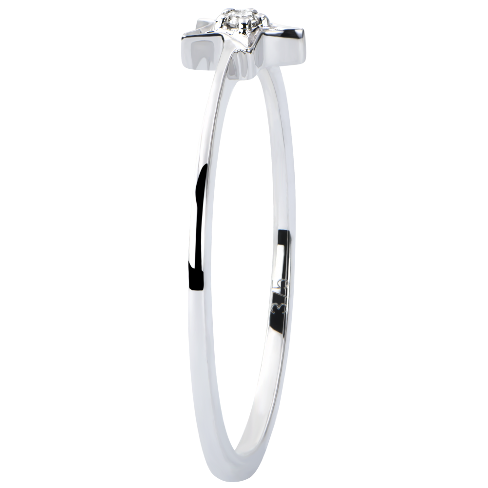 El clásico modelo de estrella en oro blanco montado en un diamante, dan forma a este anillo discreto y singular.
