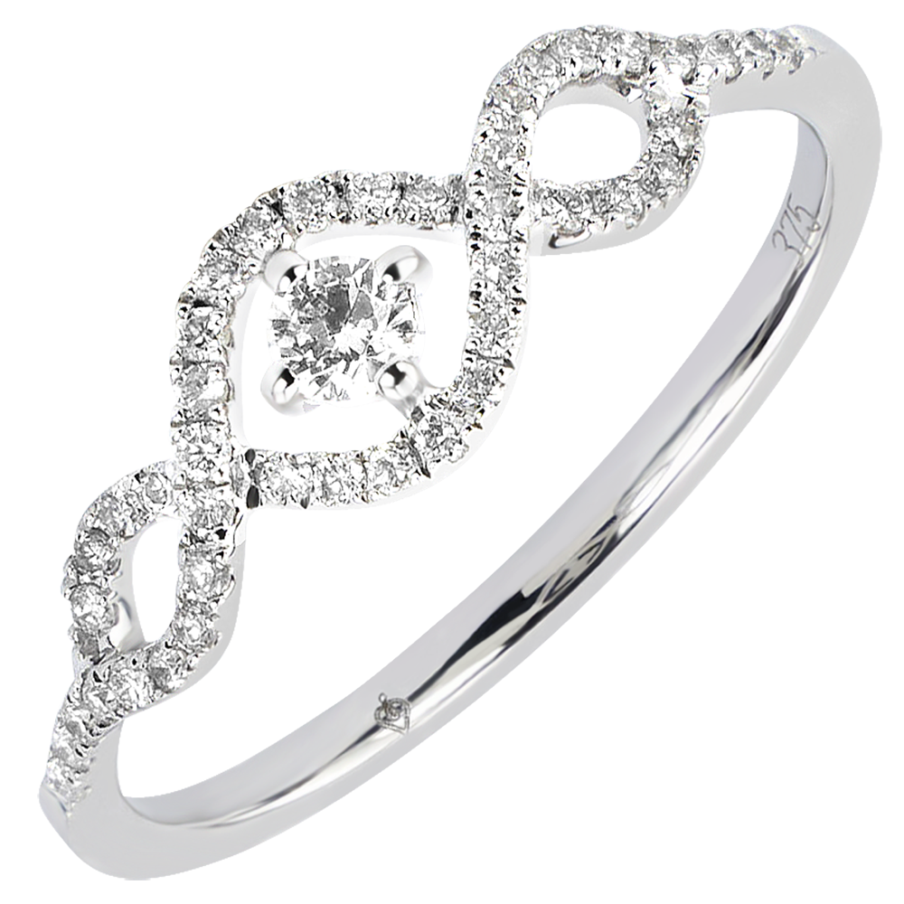 Un diamante de piedra central entrelazada con volutas engastadas con diamantes, dando como resultado un modelo completamente femenino y delicado.