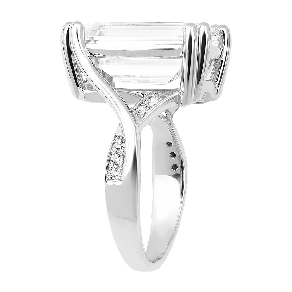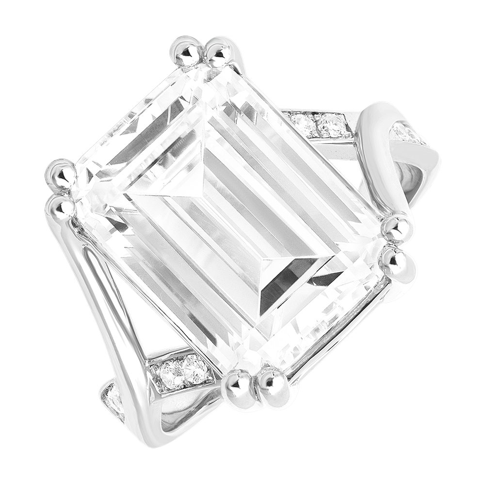 El anillo Altaé es una joya impactante con un diamante sintético talla esmeralda de 10 quilates, realzado por una banda pavé de diseño arquitectónico.