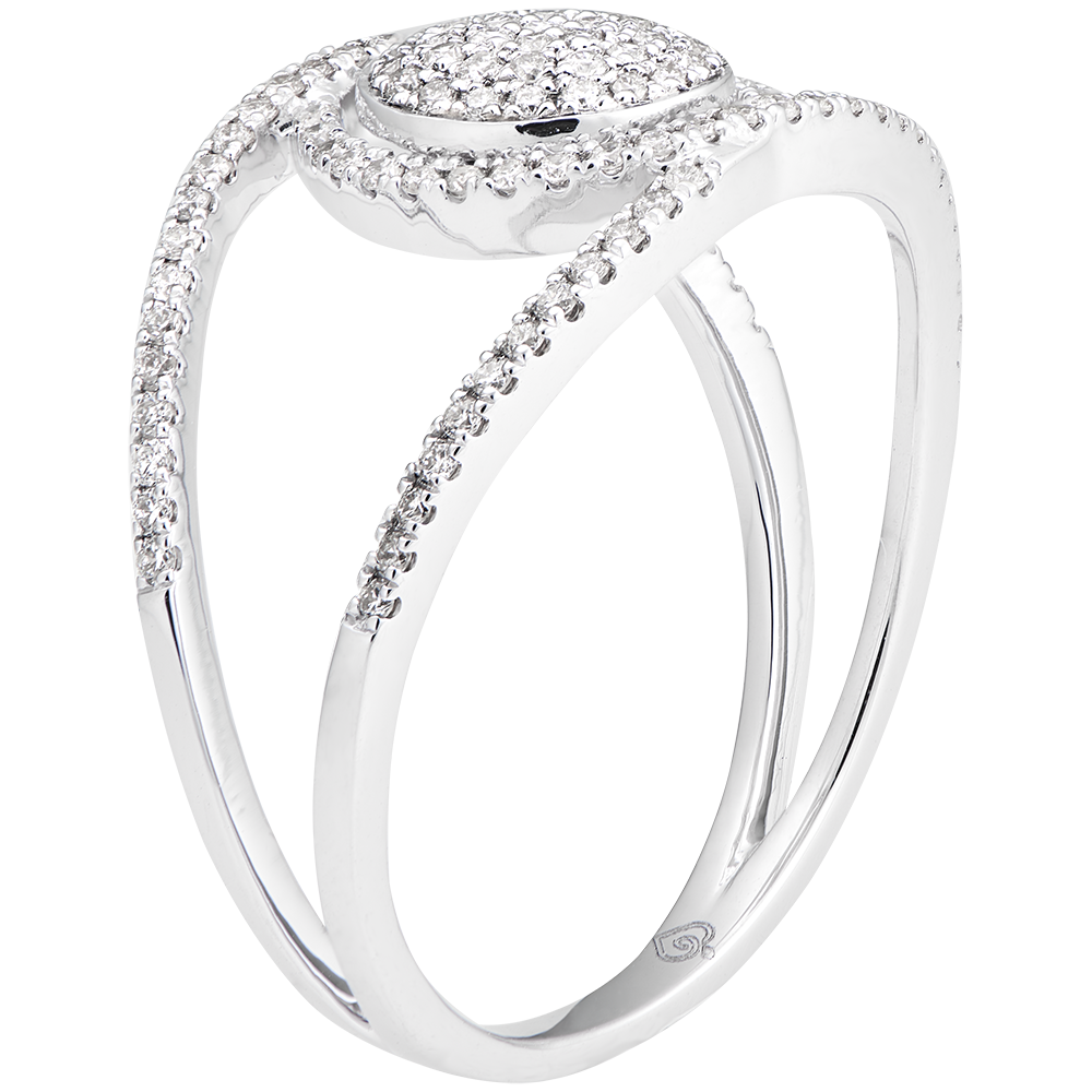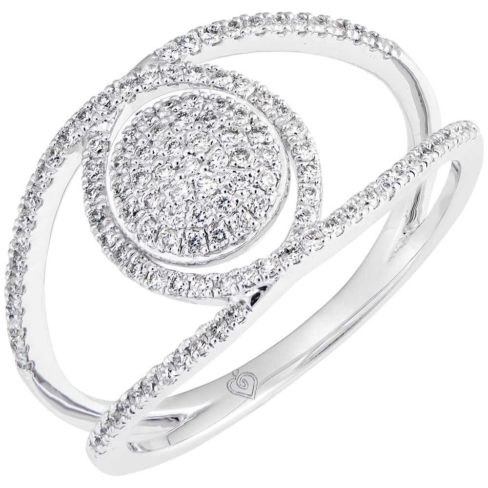 Un cúmulo de diamantes hipnóticos, enroscados en una montura espiral empedrada de diamantes. Un anillo majestuoso y a la vez ligero, calado en el dedo.