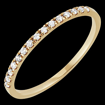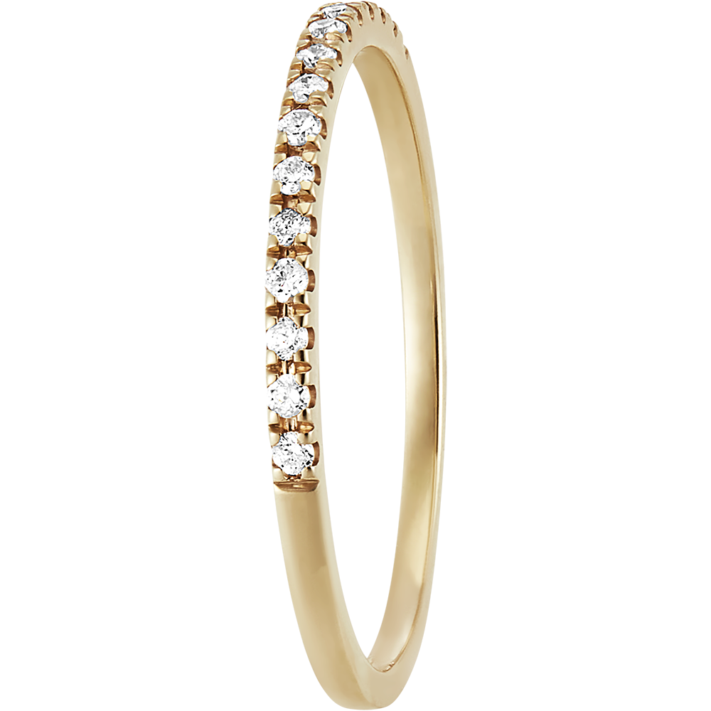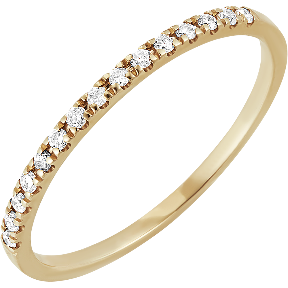 Un anillo de boda de oro amarillo elegante y atemporal adornado con delicados diamantes. Este anillo de boda es ideal para llevar con un anillo de compromiso o por sí solo.