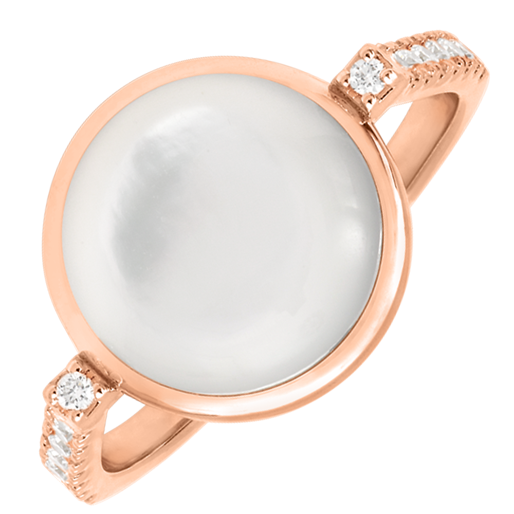 Elegante y luminosa, la sortija Cabochon Aura Nacrée combina la suavidad de un cabujón de nácar blanco con el brillo de diamantes engastados en oro. Su diseño depurado realza la piedra central y añade un toque moderno y refinado. Puede llevarse sola o combinada con nuestras alianzas Contour —lisos o engastados— para formar el trío Romance Moderne, una alianza perfecta entre minimalismo y feminidad.