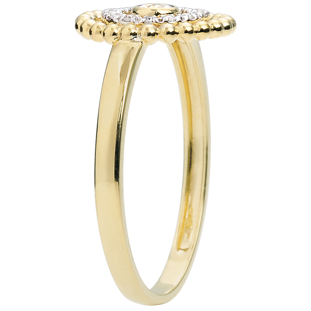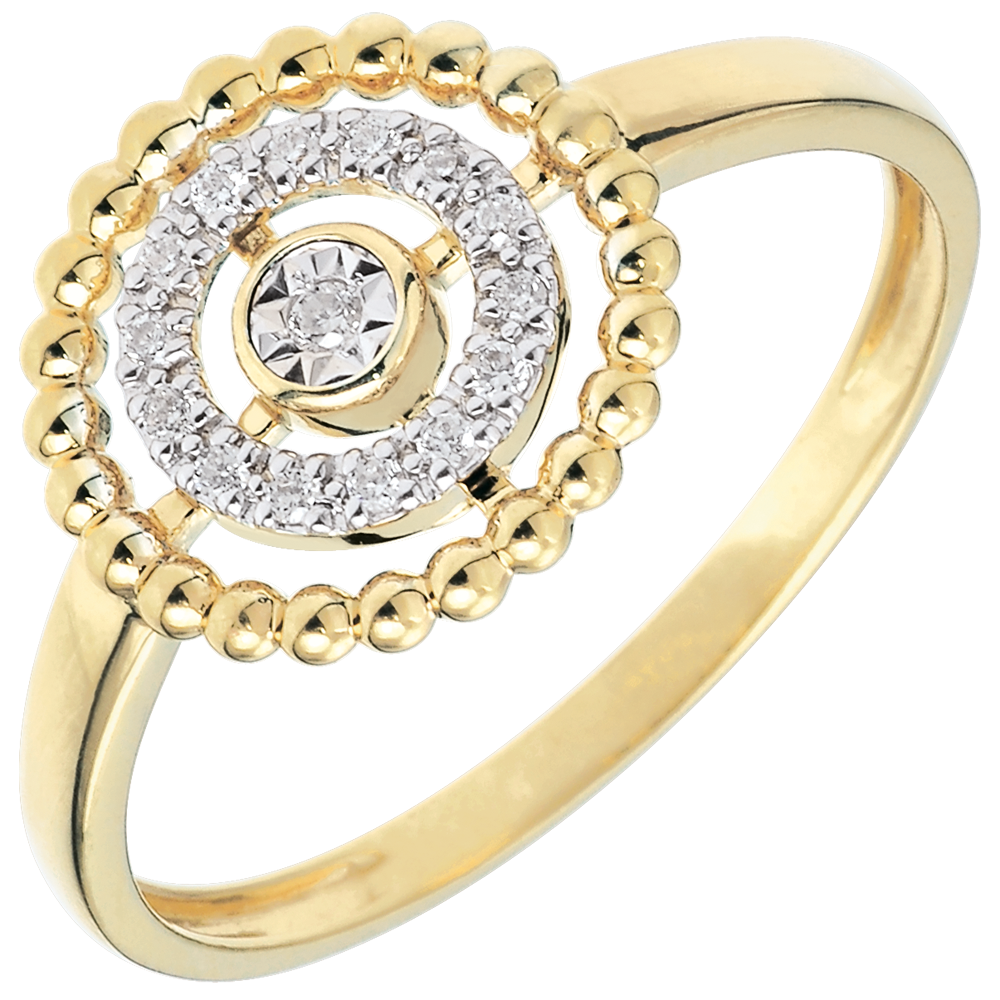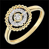 Un circulo de perlas de oro enmarcados por un circulo de diamantes y un solitario en su centro.