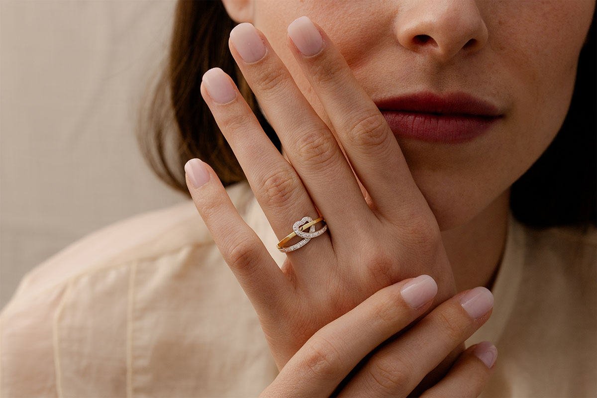 Una cinta de oro blanco solada por diamantes toma sutilmente la forma de un corazón agarrándose a un anillo de oro amarillo.