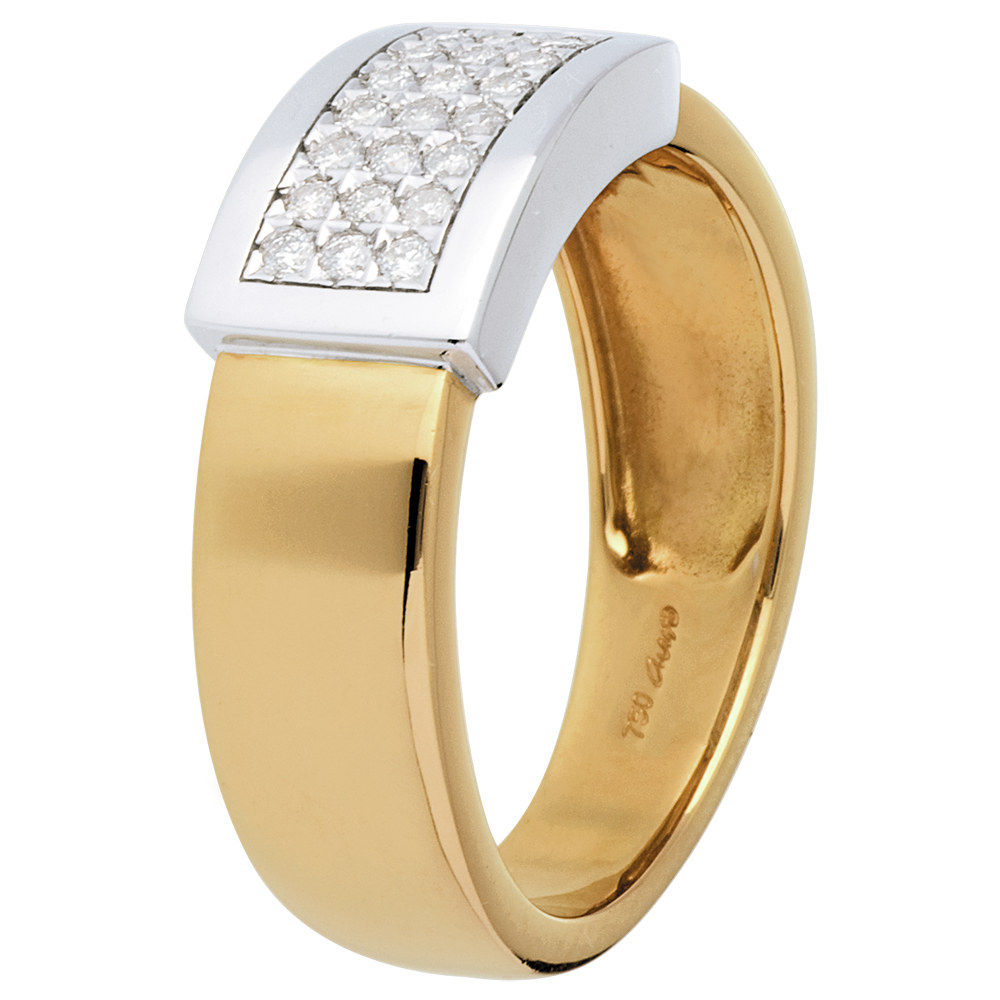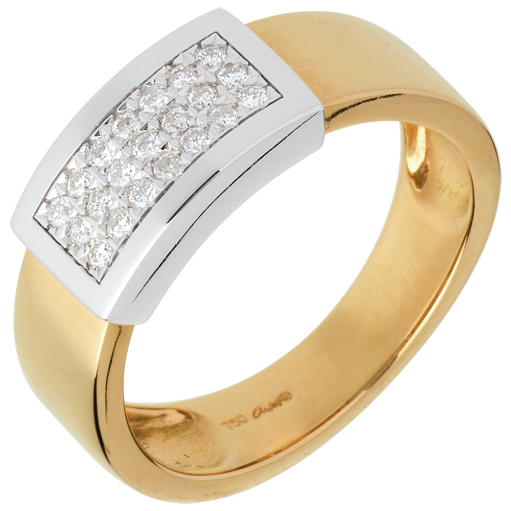 Una montura sobria y gráfica para una aleación de oro amarillo y de oro blanco de carácter, magnificado por un pavimento diamante. Un anillo impregnado de atadero y de punto.