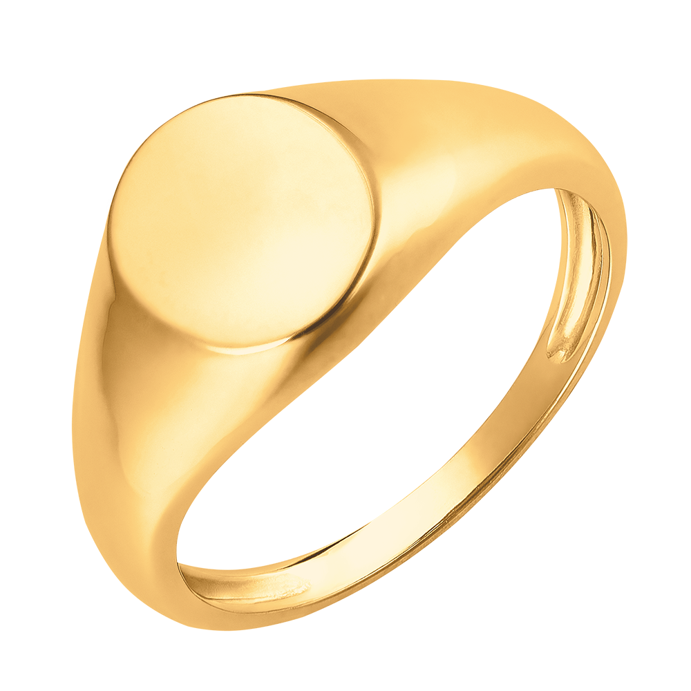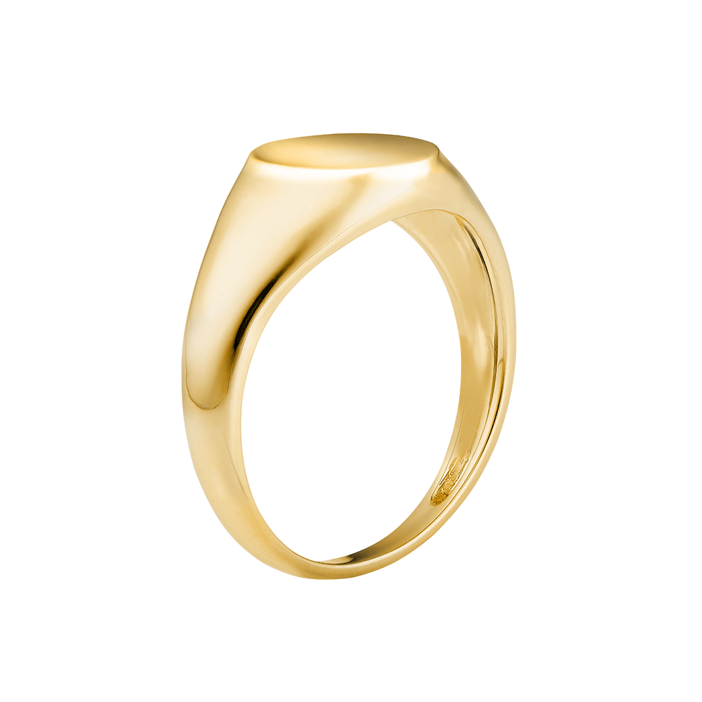 Un Anillo de Sello todo en oro amarillo en una bandeja ovalada. Una joya sencilla y elegante al mismo tiempo.