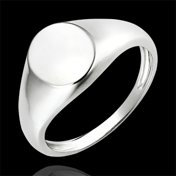 Un Anillo de Sello todo en oro blanco en una bandeja ovalada. Una joya sencilla y elegante al mismo tiempo.