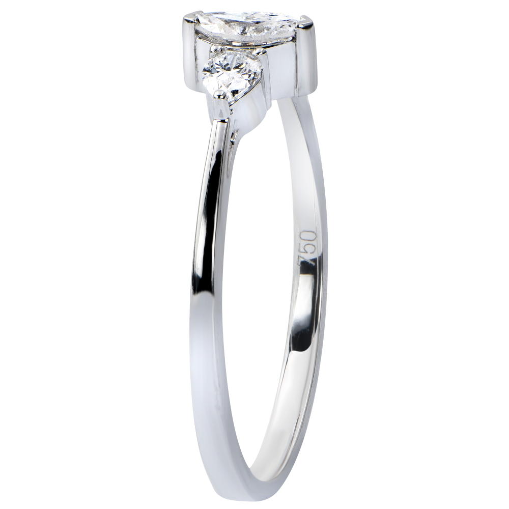 La delicadeza de una trilogía de diamantes, que unen con elegancia un diamante marquesa con dos diamantes pera.
