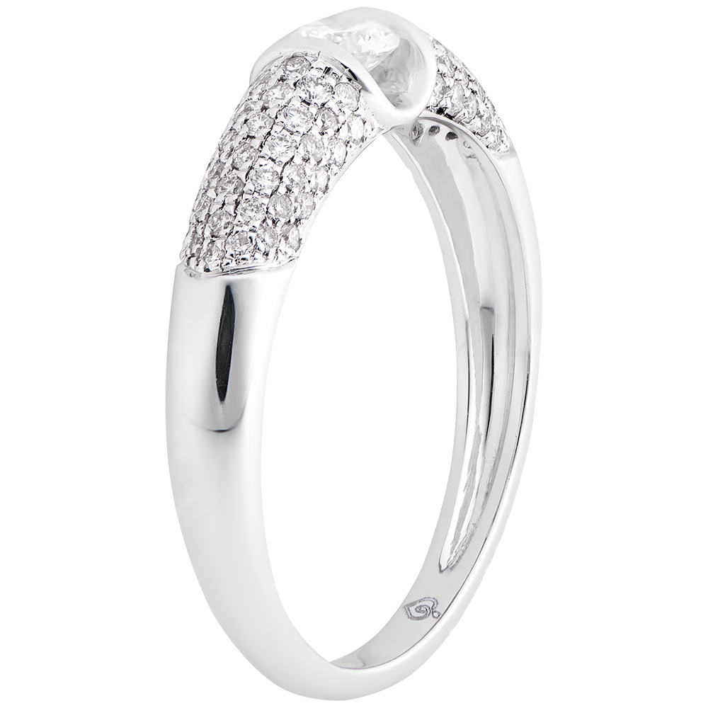 Lo sagrado de un diamante realzado por un empedrado generoso en las 3 partes de la montura. Un Anillo de compromiso completamente brillante.
