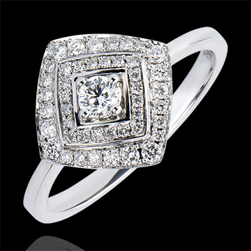 Una montura impresa con un diseño art-deco, gráfico y majestuoso, conformado por un diamante en el centro y realzado con un engaste doble de diamantes en forma de aureola. Un anillo con un estilo y un carácter evidentes.