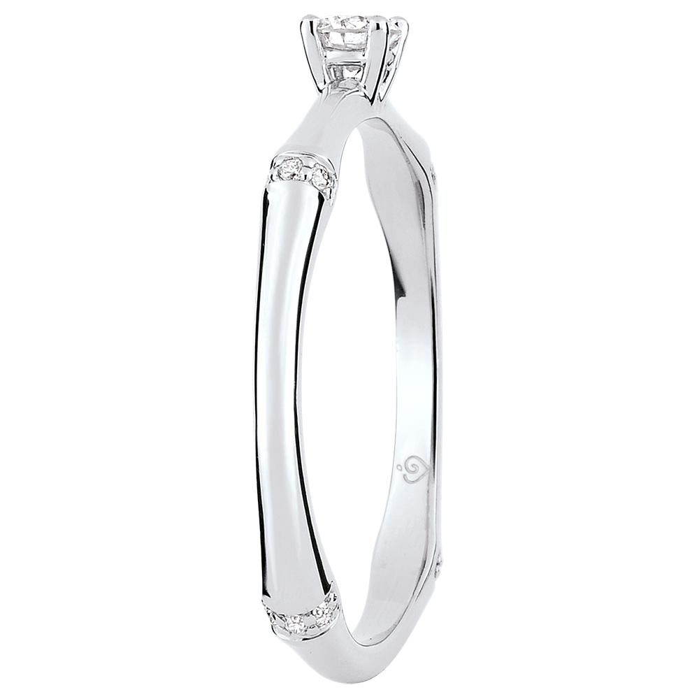 Una rama de bambú flexible y sólida se convierte en un anillo de compromiso eterno. Los nodos de bambú están incrustados de diamantes en el oro blanco para resaltar el diamante solitario.