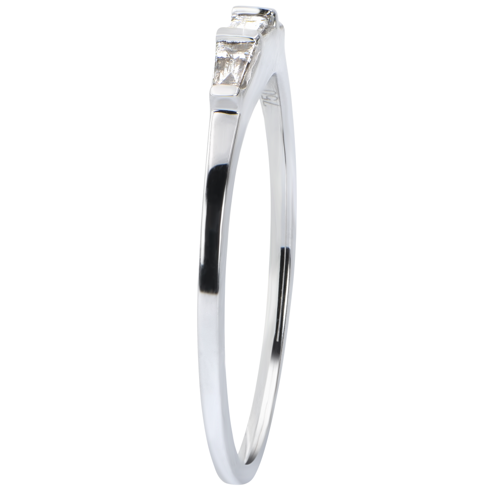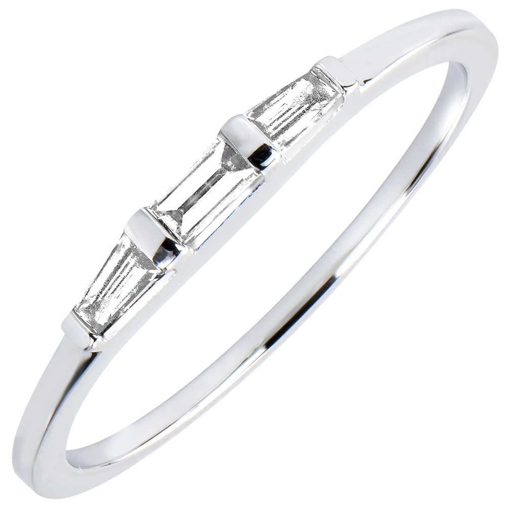 Una trilogía de diamantes estilo baguette con líneas puras dando como resultado un gran clásico del solitario acompañado.
