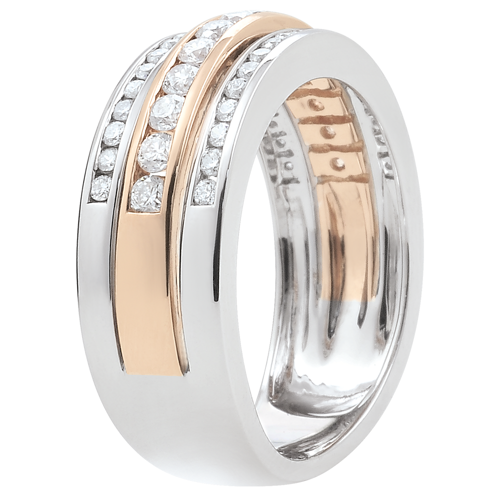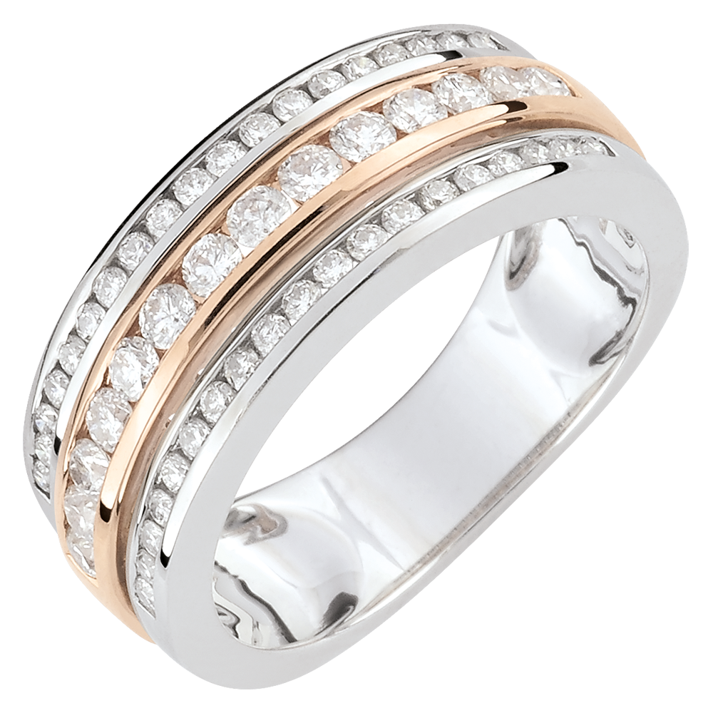 Tres railes de diamantes sobre oro rosa crean un efecto de volumen radiante jugando con el tamaño de las piedras.…