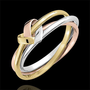 El corazón, ícono de la joyería, revisitada por Edenly en una versión origami donde los 3 oros se unen con originalidad y elegancia. Un motivo de la identidad de la marca en este anillo trilogía compuesto de 3 anillos de oro amarillo, oro blanco y oro rosado.