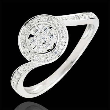 Una flor de 7 diamantes es envuelta en oro facété para un último pedazo en el corazón de una montura chispeante de oro y diamantes.