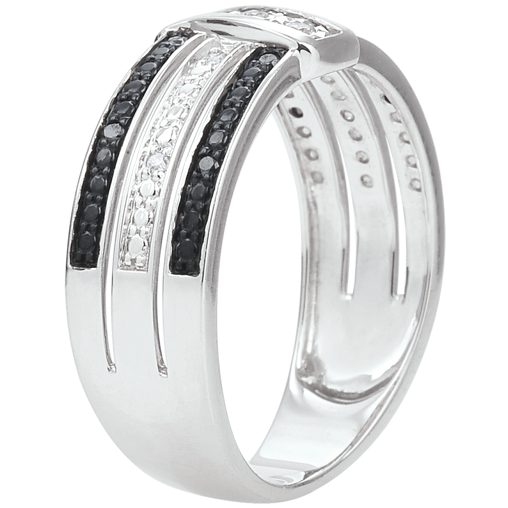 Tres sublimes diamantes posados sobre una banda de oro blanco diamantado para realzar todo su brillo, componen la base de este Anillo Claroscuro de tres aros de los cuales dos comportan diamantes negros.
