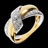 Un anillo doble de oro amarillo y de oro blanco y diamantes anudado por una cinta en diamantes.