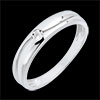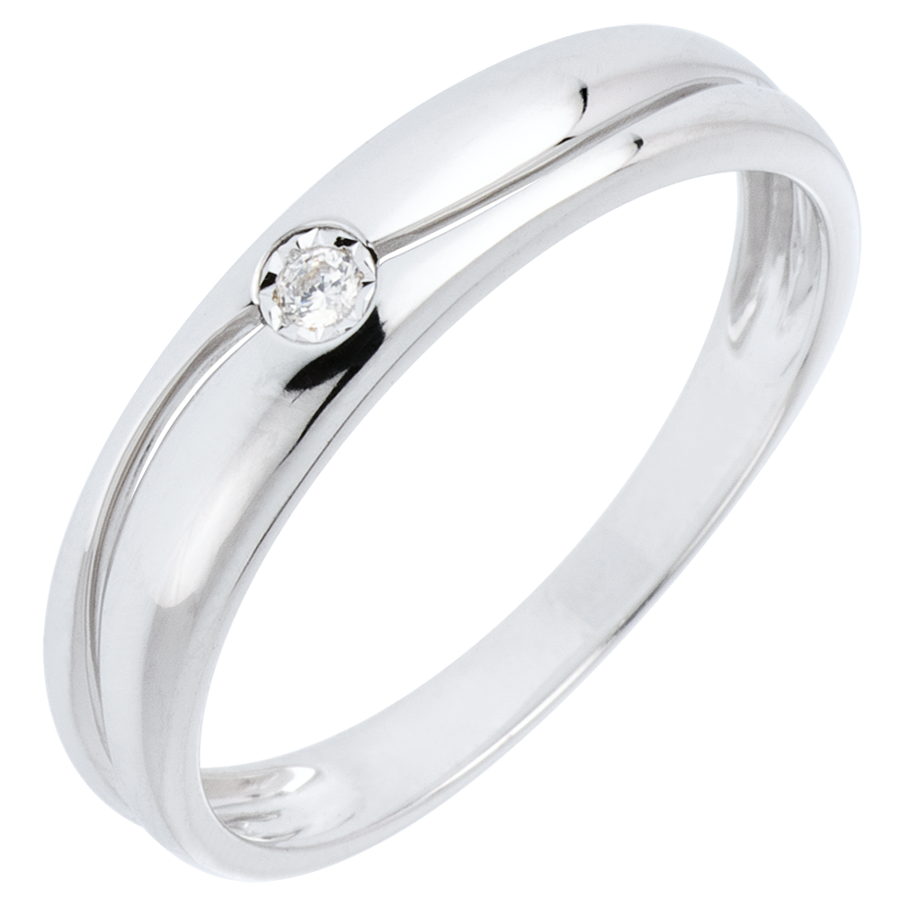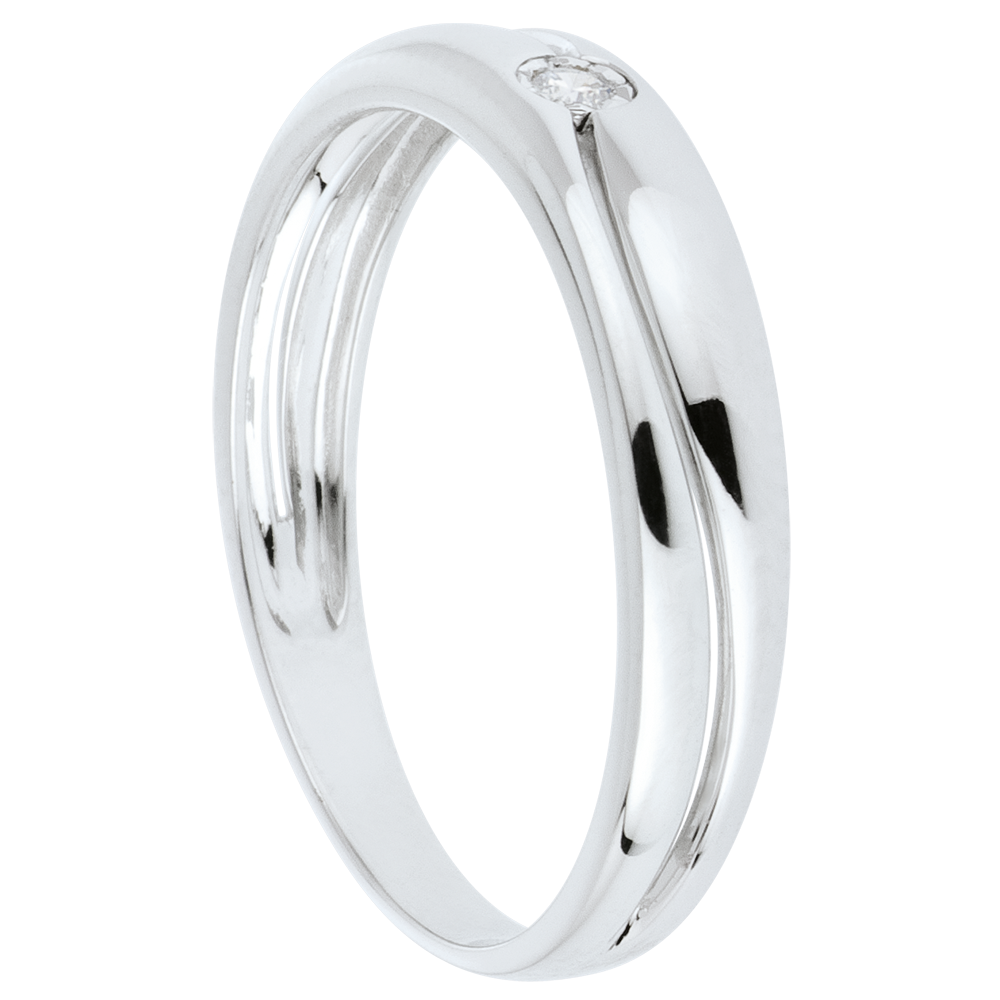 Un anillo de oro blanco es surcado por una curva armoniosa sobre la que se reina un diamante solitario.