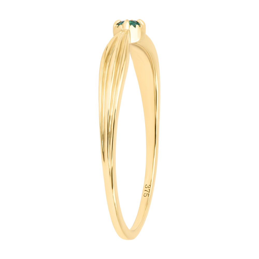 Una esmeralda sintética redonda y luminosa adorna el centro de una banda fina y delicadamente esculpida en oro amarillo de 9 quilates. Este diseño evoca la brisa suave que acaricia las hojas doradas.