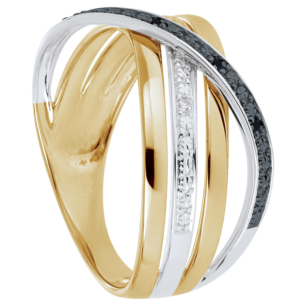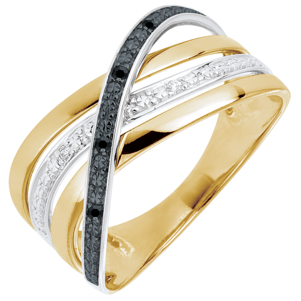 Una triple banda de oro se cruza con una onda de oro con diamantes blancos y negros.