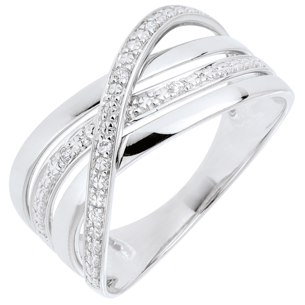 Una triple banda de oro blanco se cruza con una onda de oro blanco con diamantes.