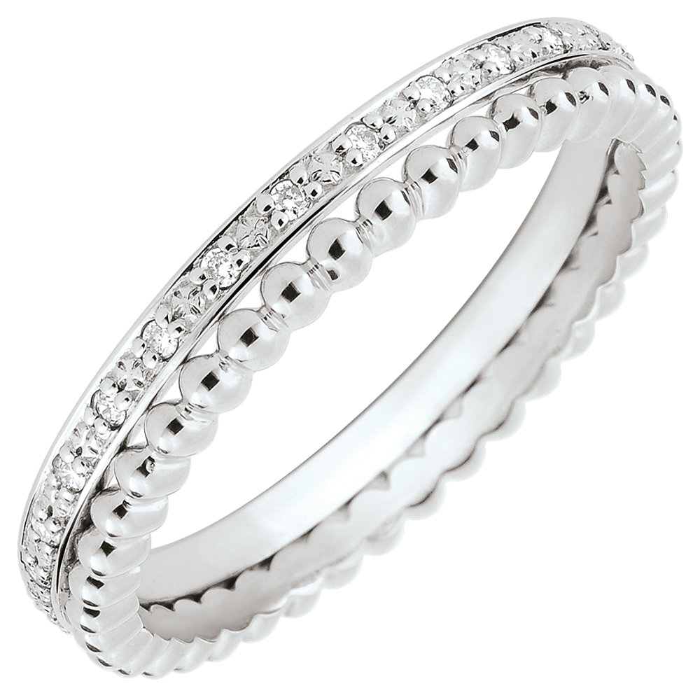 Un anillo en oro blanco engastado de diamantes se une a un anillo de perlas de oro para formar un dúo delicado. Una alianza femenina a la vez clásica y original.