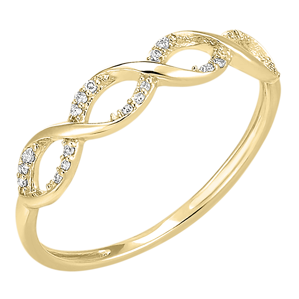 Un anillo con hilos de oro amarillo trenzados y cubiertos con diamantes resplandecientes.
