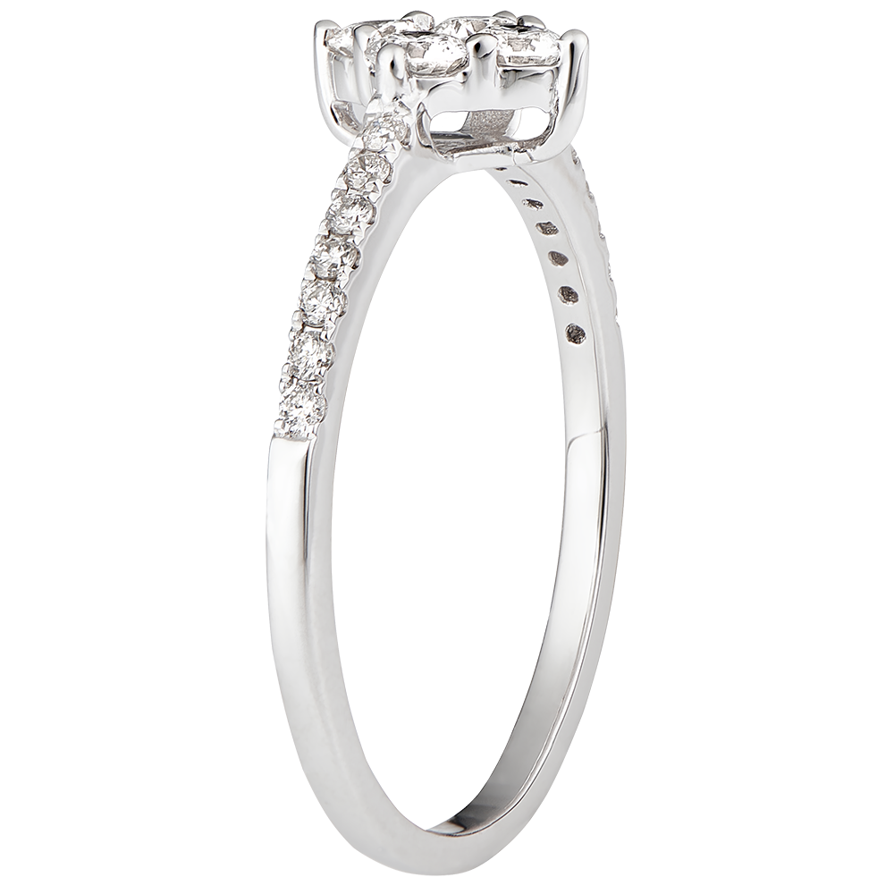 Un cuadrado de oro blanco con 5 diamantes engastados añade un toque precioso y moderno a este anillo. Anillo con medio diamante engastado.